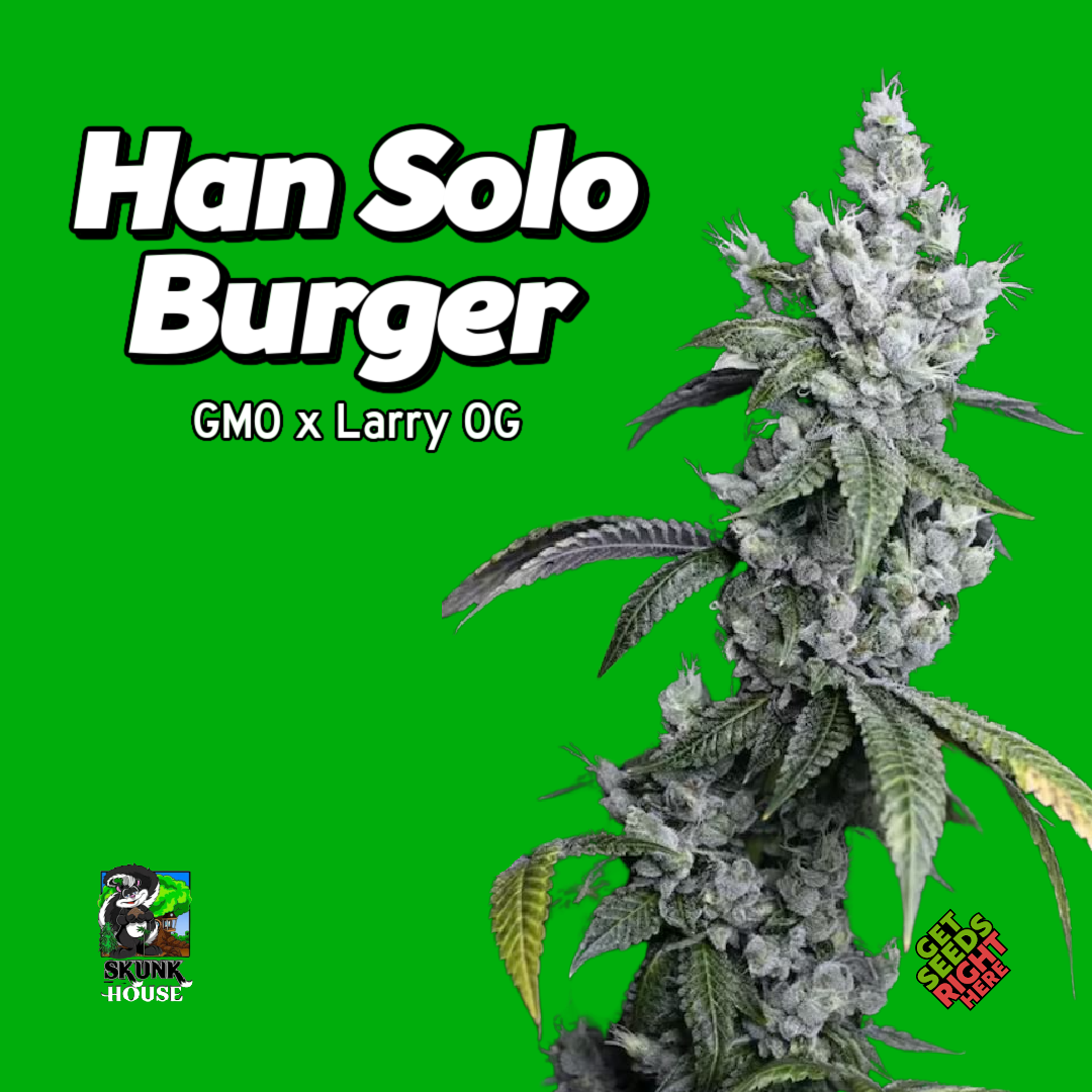 Han Solo Burger = GMO × Larry OG – a potent indica powerhouse engineered for growers and hash makers who demand maximum resin and suffocating gas. Skunk House Genetics combined two legendary OG lineages to create a strain that checks every box: yield, potency, and that unmistakable garlic-onion funk that GMO heads obsess over.